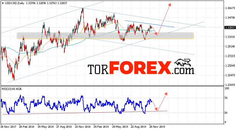 В пользу подъёма валютной пары USD/CAD выступит тест восходящей линии поддержки на индикаторе относительной силы. Вторым сигналом завершение формирования разворотной модели «Голова и плечи». Отменой варианта роста котировок USD/CAD на текущей торговой неделе 2 — 6 декабря 2019 станет падение и пробой области 1.2915. Это укажет на пробой нижней границы канала и продолжения падения в область ниже уровня 1.2435. Подтверждением роста и развития бычьей тенденции по паре выступит пробой верхней границы нисходящего канала и закрытие выше уровня 1.3355.