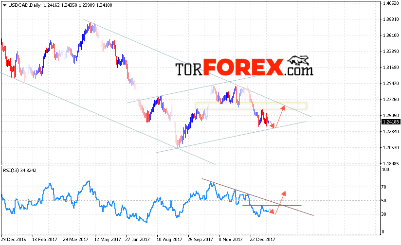 Таким образом, USD/CAD прогноз FOREX на 22 — 26 января 2018 предполагает попытку теста нижней границы канала вблизи 1.2350 и продолжения роста с целью выше 1.2650, дополнительным сигналом в пользу роста выступит тест линии поддержки на индикаторе относительной силы, отменой варианта роста станет пробой области 1.2180, что укажет на пробой нижней границы канала и продолжение падения.