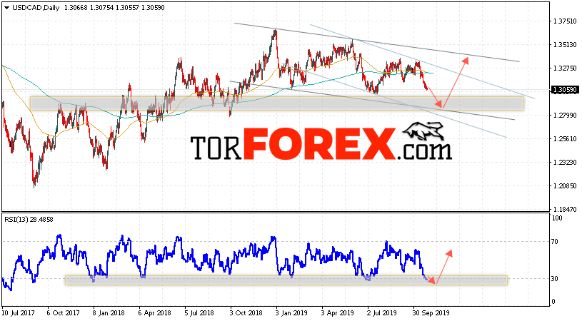 В пользу подъёма валютной пары USD/CAD выступит тест области поддержки на индикаторе относительной силы. Вторым сигналом выступит отскок от нижней границы нисходящего канала. Отменой варианта роста котировок USD/CAD на текущей торговой неделе 28 октября — 1 ноября 2019 станет падение и пробой области 1.2675. Это укажет на пробой нижней границы канала и продолжения падения в область ниже уровня 1.2225. Подтверждением роста и развития бычьей тенденции по паре выступит пробой верхней границы нисходящего канала и закрытие выше уровня 1.3535.