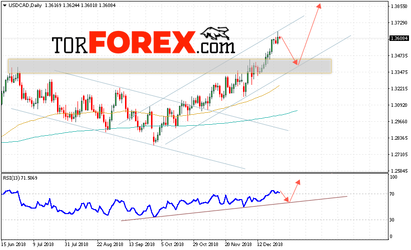 Таким образом, USD/CAD прогноз FOREX на 31 декабря — 4 января 2019 предполагает попытку теста области поддержки вблизи уровня 1.3465. Далее начала роста с целью выше уровня 1.3935. Дополнительным сигналом в пользу роста выступит тест линии тренда на индикаторе относительной силы. Отменой варианта развития восходящей тенденции станет падение и пробой области 1.3335. Это укажет на пробой нижней границы канала и продолжение снижения пары.