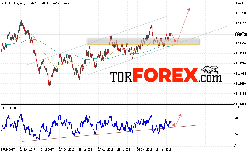 В пользу подъёма валютной пары USD/CAD выступит тест линии поддержки на индикаторе относительной силы. Вторым сигналом выступит отскок от нижней границы восходящего канала. Отменой варианта роста котировок USD/CAD на текущей торговой неделе 1 — 5 апреля 2019 станет падение и пробой области 1.2965. Это укажет на пробой нижней границы канала и продолжения падения в область ниже уровня 1.2675. Подтверждением роста пары выступит пробой области сопротивления и закрытие выше уровня 1.3525.