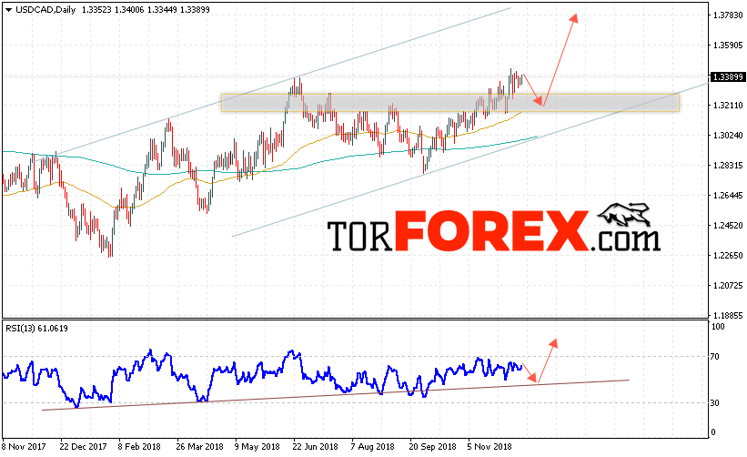 В пользу роста пары USD/CAD выступит тест восходящей линии тренда на индикаторе относительной силы. А также отскок от области поддержки на графике цены. Отменой варианта роста котировок USD/CAD на текущей торговой неделе 17 — 21 декабря 2018 станет падение и пробой области 1.2970. Это укажет на пробой нижней границы канала и продолжения падения в область ниже уровня 1.2650. Подтверждением роста пары выступит пробой области сопротивления и закрытие выше уровня 1.3475.
