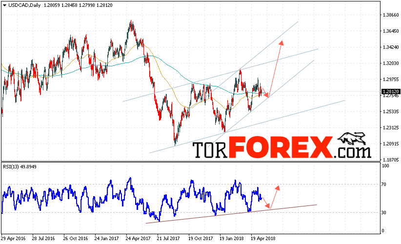 Таким образом, USD/CAD прогноз FOREX на неделю 21 — 25 мая 2018 предполагает попытку теста области поддержки вблизи уровня 1.2750 и продолжения роста с целью выше уровня 1.3450, дополнительным сигналом в пользу роста выступит тест линии тренда на индикаторе относительной силы, отменой варианта роста станет пробой области 1.2540, что укажет на пробой нижней границы восходящего канала и продолжение падения пары.