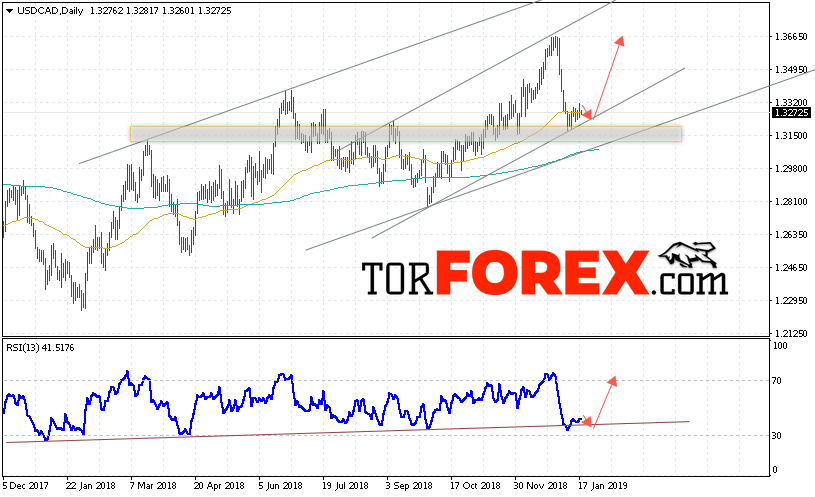 Таким образом, USD/CAD прогноз FOREX на неделю 21 — 25 января 2019 предполагает попытку теста области поддержки вблизи уровня 1.3235. Далее продолжение роста с целью выше уровня 1.3665. Дополнительным сигналом в пользу подъёма выступит тест линии тренда на индикаторе относительной силы. Отменой варианта развития восходящей тенденции станет падение и пробой области 1.3550. Это укажет на пробой нижней границы канала и продолжение снижения пары.