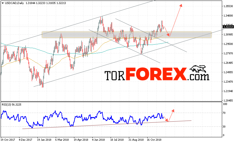 Таким образом, USD/CAD прогноз FOREX на неделю 26 — 30 ноября 2018 предполагает попытку теста области поддержки вблизи уровня 1.3080. Далее начала роста с целью выше уровня 1.3555. Дополнительным сигналом в пользу роста выступит тест линии тренда на индикаторе относительной силы. Отменой варианта развития восходящей тенденции станет падение и пробой области 1.2900. Это укажет на пробой нижней границы канала и продолжение снижения пары.