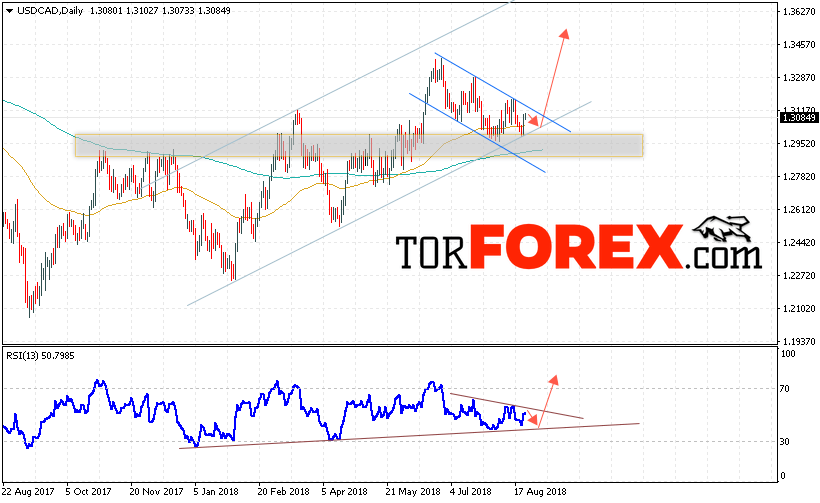 Таким образом, USD/CAD прогноз FOREX на неделю 27 — 31 августа 2018 предполагает попытку теста области поддержки вблизи уровня 1.3030 и начала роста с целью выше уровня 1.3565, дополнительным сигналом в пользу роста выступит тест линии тренда на индикаторе относительной силы, отменой варианта развития восходящей тенденции станет падение и пробой области 1.2900, что укажет на пробой нижней границы канала и продолжение снижения пары.