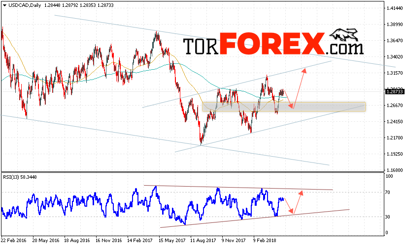 Таким образом, USD/CAD прогноз FOREX на неделю 7 — 11 мая 2018 предполагает попытку теста области поддержки вблизи уровня 1.2670 и продолжения роста с целью выше уровня 1.3150, дополнительным сигналом в пользу роста выступит тест линии тренда на индикаторе относительной силы, отменой варианта роста станет пробой области 1.2400, что укажет на пробой нижней границы восходящего канала и продолжение падения пары.