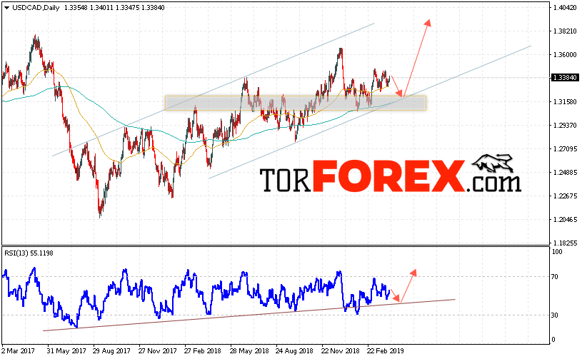 В пользу подъёма валютной пары USD/CAD выступит тест линии поддержки на индикаторе относительной силы. Вторым сигналом выступит отскок от нижней границы восходящего канала. Отменой варианта роста котировок USD/CAD на текущей торговой неделе 8 — 12 апреля 2019 станет падение и пробой области 1.2945. Это укажет на пробой нижней границы канала и продолжения падения в область ниже уровня 1.2675. Подтверждением роста пары выступит пробой области сопротивления и закрытие выше уровня 1.3535.