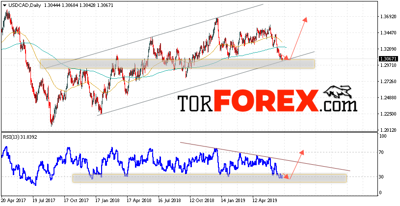 В пользу подъёма валютной пары USD/CAD выступит тест восходящей линии поддержки на индикаторе относительной силы. Вторым сигналом выступит отскок от нижней границы восходящего канала. Отменой варианта роста котировок USD/CAD на текущей торговой неделе 8 — 12 июля 2019 станет падение и пробой области 1.2870. Это укажет на пробой нижней границы канала и продолжения падения в область ниже уровня 1.2625. Подтверждением роста пары выступит пробой области сопротивления и закрытие выше уровня 1.3225.