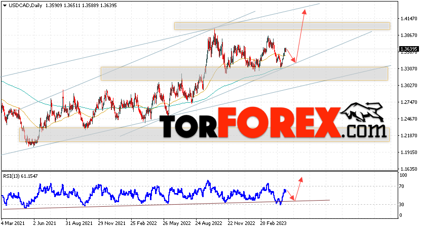 Дополнительным сигналом в пользу подъёма валютной пары USD/CAD выступит тест восходящей линии тренда на индикаторе относительной силы. Вторым сигналом станет отскок от нижней границы бычьего канала. Отменой варианта подъёма котировок валютной пары USD/CAD на текущей торговой на неделе 1 — 5 мая 2023 станет падение и пробой области 1.3235. Это укажет на пробой поддержки и продолжения падения в область ниже уровня 1.2895. Подтверждением подъёма по паре выступит пробой области сопротивления и закрытие цены над уровнем 1.3865.