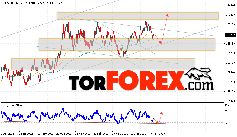Дополнительным сигналом в пользу роста валютной пары USD/CAD выступит тест медвежьей линии тренда на индикаторе относительной силы. Вторым сигналом станет отскок от нижней границы бычьего канала. Отменой варианта роста котировок валютной пары USD/CAD на текущей торговой на неделе 11 — 15 декабря 2023 станет падение и пробой области 1.3205. Это укажет на пробой поддержки и продолжения падения в область ниже уровня 1.2835. Подтверждением росту по паре выступит пробой области сопротивления и закрытие цены над уровнем 1.3805, что укажет на пробой верхней границы нисходящего канала коррекции.