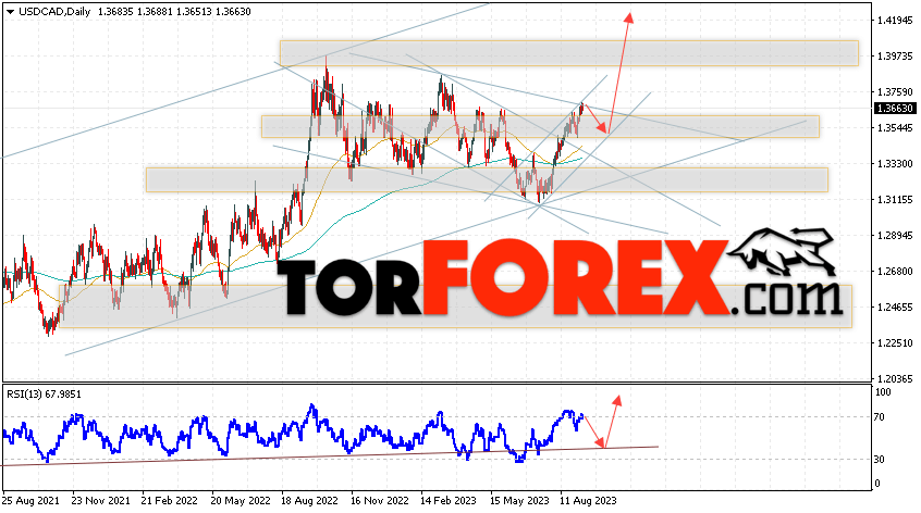 Дополнительным сигналом в пользу роста валютной пары USD/CAD выступит тест медвежьей линии тренда на индикаторе относительной силы. Вторым сигналом станет отскок от нижней границы бычьего канала. Отменой варианта роста котировок валютной пары USD/CAD на текущей торговой на неделе 11 — 15 сентября 2023 станет падение и пробой области 1.3325. Это укажет на пробой поддержки и продолжения падения в область ниже уровня 1.2965. Подтверждением росту по паре выступит пробой области сопротивления и закрытие цены над уровнем 1.3775, что укажет на пробой верхней границы очередного нисходящего канала.