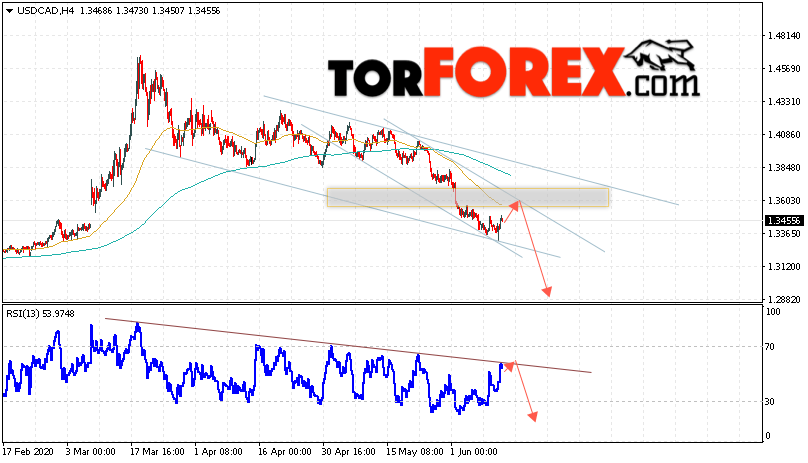 Таким образом, USD/CAD прогноз Канадский Доллар на 12 июня 2020 предполагает попытку теста области сопротивления вблизи уровня 1.3455. Далее, продолжение падения в область ниже уровня 1.3015. Дополнительным сигналом в пользу падения Канадского Доллара на Форекс выступит тест линии тренда на индикаторе относительной силы. Отменой варианта снижения котировок USD/CAD станет сильный рост и пробой уровня 1.3705. Это укажет на продолжение подъёма с потенциальной целью выше уровня 1.3915.