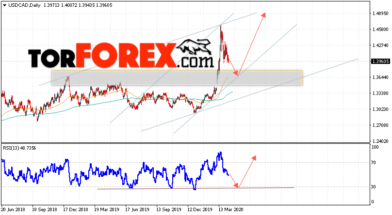 В пользу роста валютной пары USD/CAD выступит тест линии поддержки на индикаторе относительной силы. Вторым сигналом станет отскок от нижней границы восходящего канала. Отменой варианта роста котировок валютной пары USD/CAD на текущей торговой неделе 13 — 17 апреля 2020 станет падение и пробой области 1.3545. Это укажет на пробой нижней границы канала и продолжения падения в область ниже уровня 1.3015. Подтверждением роста по паре выступит пробой области сопротивления и закрытие цен выше уровня 1.4345.