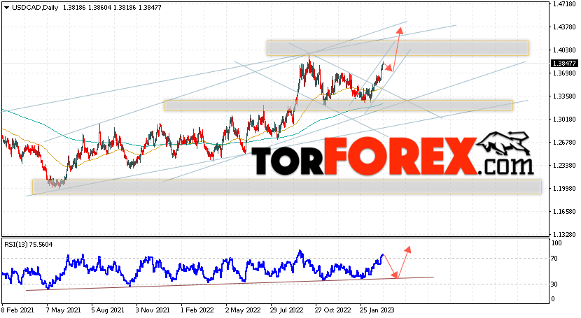 Таким образом, USD/CAD прогноз Канадский Доллар на 13 — 17 марта 2023 предполагает попытку развития нисходящей коррекции и теста области поддержки вблизи уровня 1.3695. Далее, продолжение роста с целью выше уровня 1.4395. Дополнительным сигналом в пользу подъёма выступит тест долгосрочной бычьей линии тренда на индикаторе относительной силы. Отменой варианта развития роста станет падение и пробой области 1.3325. Это укажет на пробой важной поддержки и продолжение снижения подъёма с целью ниже 1.2735.