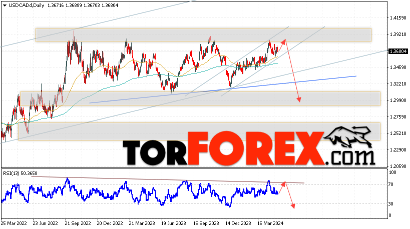 Дополнительным сигналом в пользу падения валютной пары USD/CAD выступит тест медвежьей линии тренда на индикаторе относительной силы. Вторым сигналом станет отскок от верхней границы разворотной модели «Голова и плечи». Отменой варианта падения котировок валютной пары USD/CAD на текущей торговой на неделе 13 — 17 мая 2024 станет сильный рост и пробой области 1.4085. Это укажет на пробой сопротивления и продолжения роста в область выше уровня 1.4395. Подтверждением падению по паре выступит пробой нижней границы бычьего канала и закрытие цены под уровнем 1.3455.