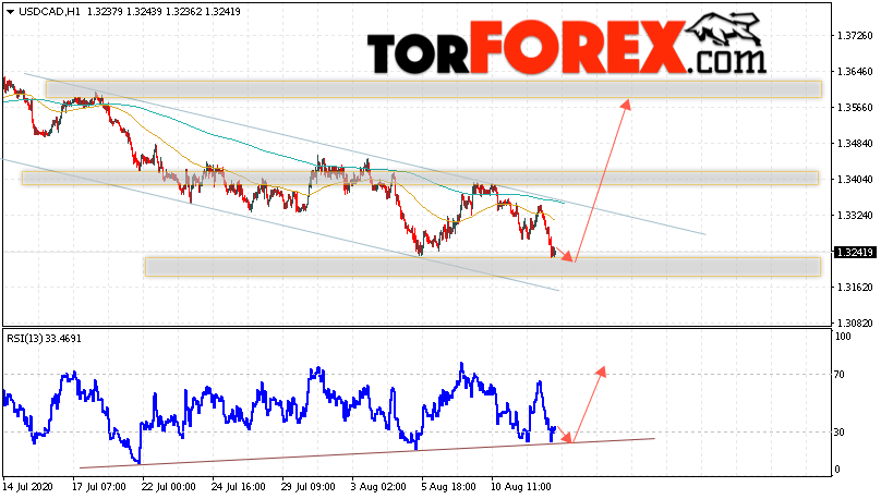 Валютная пара Доллар США Канадский Доллар USD/CAD продолжает движение в рамках снижения и нисходящего канала. В момент публикации прогноза курс Доллара США к Канадскому Доллару составляет 1.3241. Скользящие средние указывают на наличие краткосрочной медвежьей тенденции по паре. Цены оттолкнулись от области между сигнальными линиями, что указывает на давление со стороны продавцов и потенциальное продолжение падения цен уже в ближайшее время. На данный момент стоит ожидать попытку развития снижения и тест уровня поддержки вблизи области 1.3225. Далее, отскок вверх и продолжение роста валютной пары на Форекс. Потенциальной целью такого движения инструмента выступает область выше уровня 1.3565.