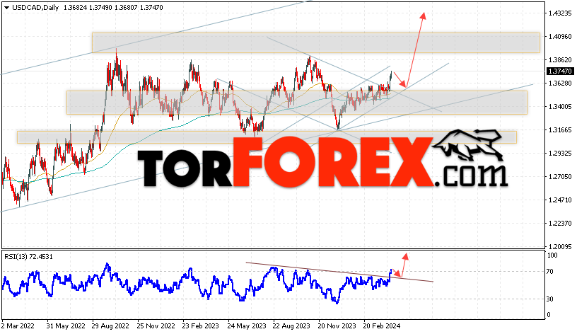 Дополнительным сигналом в пользу роста валютной пары USD/CAD выступит тест бычьей линии тренда на индикаторе относительной силы. Вторым сигналом станет отскок от нижней границы бычьего канала. Отменой варианта роста котировок валютной пары USD/CAD на текущей торговой на неделе 15 — 19 апреля 2024 станет падение и пробой области 1.3465. Это укажет на пробой поддержки и продолжения падения в область ниже уровня 1.3005. Подтверждением росту по паре выступит пробой области сопротивления и закрытие цены над уровнем 1.3875.