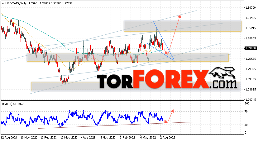 Дополнительным сигналом в пользу подъёма валютной пары USD/CAD выступит тест линии тренда на индикаторе относительной силы, как видим, с начала прошлого года значения индикатора отталкивались от этой линии вверх. Можно сказать, что это долгосрочная линия поддержки на графике индикатора RSI, пробой которой укажет на завершение роста валютной пары. Вторым сигналом станет отскок от нижней границы бычьего канала, а также от нижней границы разворотной модели ”Клин”. Отменой варианта подъёма котировок валютной пары USD/CAD на текущей торговой на неделе 15 — 19 августа 2022 станет падение и пробой области 1.2425. Это укажет на пробой поддержки и продолжения падения в область ниже уровня 1.2105. Подтверждением подъёма по паре выступит пробой области сопротивления и закрытие цены над уровнем 1.3005, что укажет на пробой верхней границы разворотной модели ”Клин” и начало отработки этой модели с целями вверху.