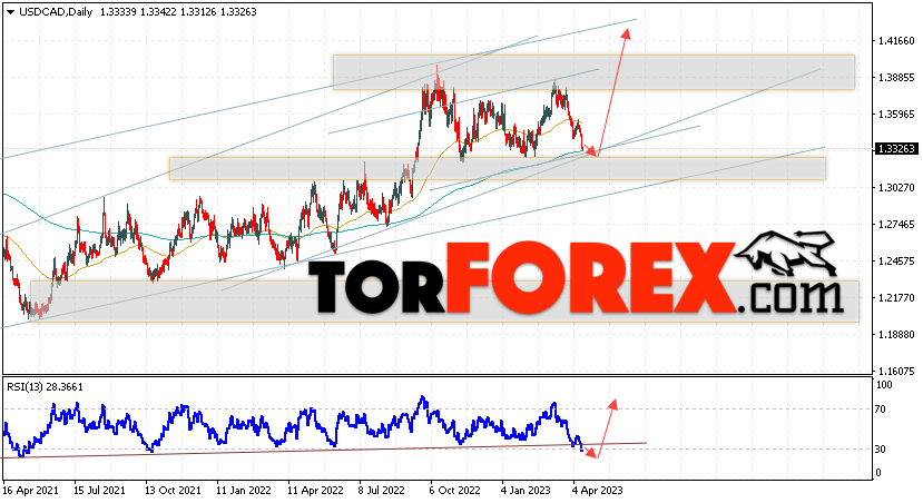 Дополнительным сигналом в пользу подъёма валютной пары USD/CAD выступит тест восходящей линии тренда на индикаторе относительной силы. Вторым сигналом станет отскок от нижней границы бычьего канала. Отменой варианта подъёма котировок валютной пары USD/CAD на текущей торговой на неделе 17 — 21 апреля 2023 станет падение и пробой области 1.3055. Это укажет на пробой поддержки и продолжения падения в область ниже уровня 1.2765. Подтверждением подъёма по паре выступит пробой области сопротивления и закрытие цены над уровнем 1.3585.