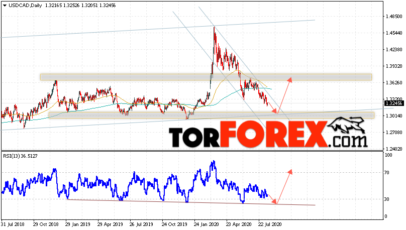 В пользу роста валютной пары USD/CAD выступит тест линии поддержки на индикаторе относительной силы. Вторым сигналом станет отскок от области поддержки. Отменой варианта роста котировок валютной пары USD/CAD на текущей торговой неделе 17 — 21 августа 2020 станет падение и пробой области 1.2875. Это укажет на пробой нижней границы канала и продолжения падения в область ниже уровня 1.2515. Подтверждением роста по паре выступит пробой области сопротивления и закрытие цен выше уровня 1.3305, что укажет на пробой верхней границы нисходящего канала.