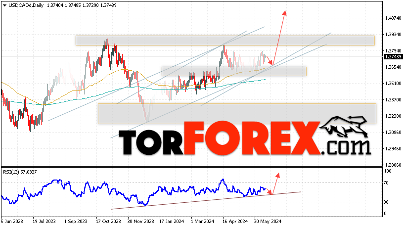 Дополнительным сигналом в пользу подъёма валютной пары USD/CAD выступит тест бычьей линии тренда на индикаторе относительной силы. Вторым сигналом станет отскок от нижней границы бычьего канала. Отменой варианта роста котировок валютной пары USD/CAD на текущей торговой на неделе 17 — 21 июня 2024 станет падение и пробой области 1.3535. Это укажет на пробой поддержки и продолжения падения в область ниже уровня 1.3245. Подтверждением подъёму по паре выступит пробой сильного уровня сопротивления и закрытие цены над 1.3965.