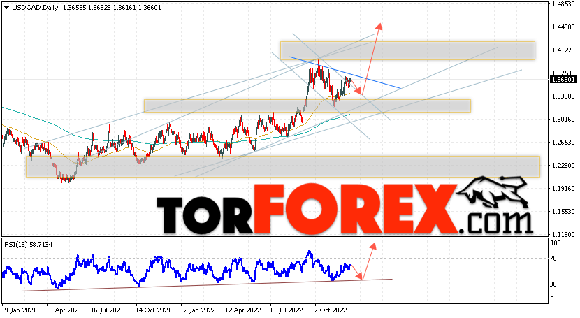 Дополнительным сигналом в пользу подъёма валютной пары USD/CAD выступит тест восходящей линии тренда на индикаторе относительной силы. Вторым сигналом станет отскок от верхней границы нисходящего канала. Отменой варианта подъёма котировок валютной пары USD/CAD на текущей торговой на неделе 19 — 23 декабря 2022 станет падение и пробой области 1.3045. Это укажет на пробой поддержки и продолжения падения в область ниже уровня 1.2645. Подтверждением подъёма по паре выступит пробой области сопротивления и закрытие цены над уровнем 1.3805, что укажет на завершение формирования разворотной модели ”Голова и плечи” и начало отработки паттерна с целями вверху.