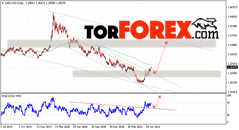 Дополнительным сигналом в пользу роста валютной пары USD/CAD выступит тест линии поддержки на индикаторе относительной силы. Вторым сигналом станет отскок от верхней границы нисходящего канала. Отменой варианта роста котировок валютной пары USD/CAD на текущей торговой на неделе 19 — 23 июля 2021 станет падение и пробой области 1.2055. Это укажет на пробой нижней границы медвежьего канала и продолжения падения в область ниже уровня 1.1625. Подтверждением подъёму по паре выступит пробой области сопротивления и закрытие цены над уровнем 1.2755.