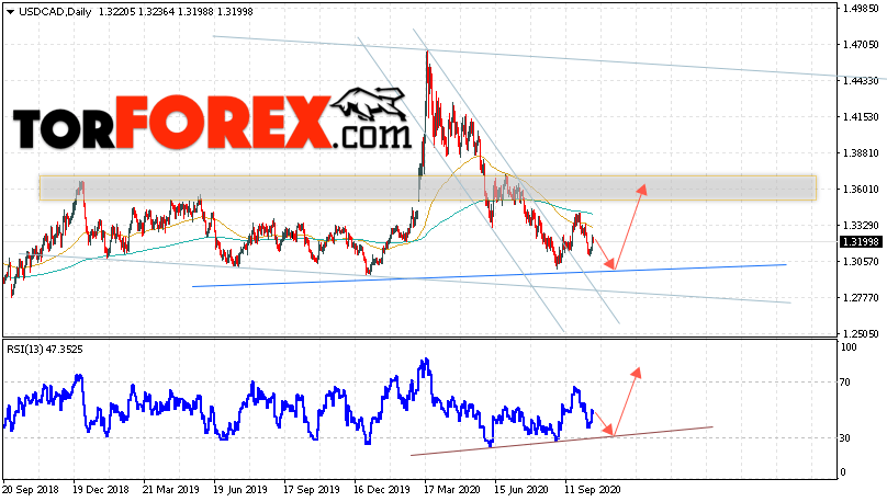 В пользу роста валютной пары USD/CAD выступит тест линии поддержки на индикаторе относительной силы. Вторым сигналом станет отскок от линии ”Шеи” разворотной модели ”Голова и плечи”. Отменой варианта подъёма котировок валютной пары USD/CAD на текущей торговой на 19 — 23 октября 2020 станет падение и пробой области 1.2735. Это укажет на пробой нижней границы канала и продолжения падения в область ниже уровня 1.2305. Подтверждением роста по паре выступит пробой области сопротивления и закрытие цен выше уровня 1.3425.