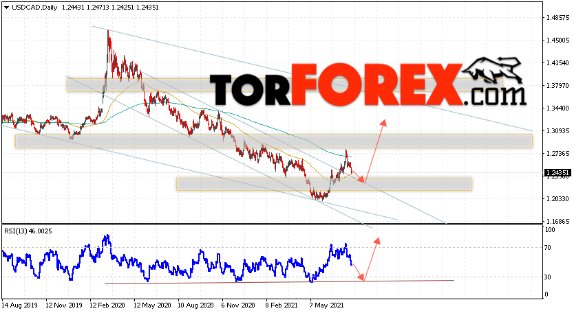 Таким образом, USD/CAD прогноз Канадский Доллар на 2 — 6 августа 2021 предполагает попытку теста области поддержки вблизи уровня 1.2375. Далее, продолжение роста с целью выше уровня 1.3195. Дополнительным сигналом в пользу подъёма выступит тест линии тренда на индикаторе относительной силы. Отменой варианта развития роста станет падение и пробой области 1.2025. Это укажет на пробой нижней границы медвежьего канала и продолжение падения пары с целью ниже 1.1645.