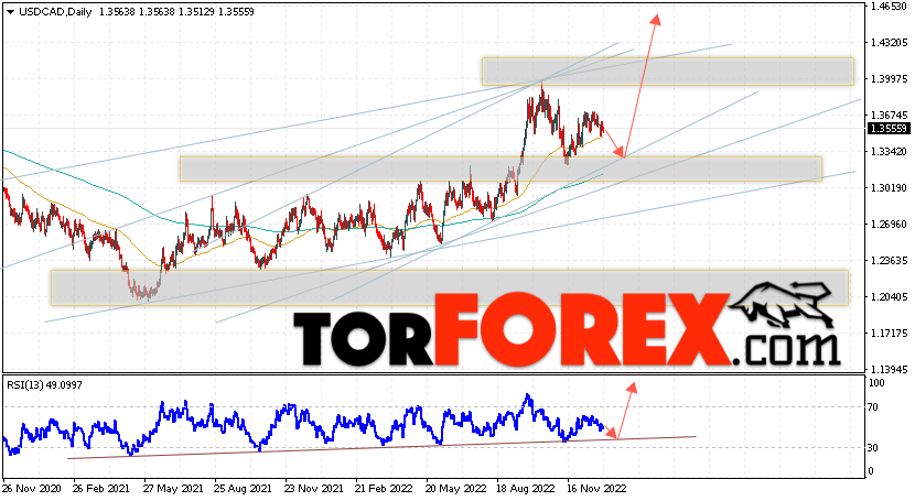 Дополнительным сигналом в пользу подъёма валютной пары USD/CAD выступит тест восходящей линии тренда на индикаторе относительной силы. Вторым сигналом станет отскок от верхней границы нисходящего канала. Отменой варианта подъёма котировок валютной пары USD/CAD на текущей торговой на неделе 26 — 30 декабря 2022 станет падение и пробой области 1.3035. Это укажет на пробой поддержки и продолжения падения в область ниже уровня 1.2715. Подтверждением подъёма по паре выступит пробой области сопротивления и закрытие цены над уровнем 1.3805.