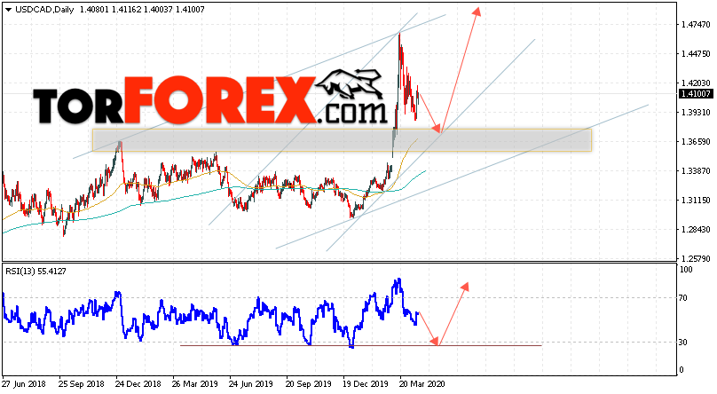 Таким образом, USD/CAD прогноз Канадский Доллар на 20 — 24 апреля 2020 предполагает попытку теста области поддержки вблизи уровня 1.3685. Далее, продолжение роста с целью выше уровня 1.4855. Дополнительным сигналом в пользу роста выступит тест линии тренда на индикаторе относительной силы. Отменой варианта развития подъёма станет падение и пробой области 1.3515. Это укажет на пробой нижней границы канала и продолжение падения пары с целью ниже 1.3025.