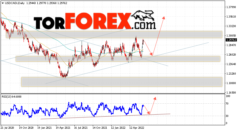 Дополнительным сигналом в пользу подъёма валютной пары USD/CAD выступит тест линии поддержки на индикаторе относительной силы. Вторым сигналом станет отскок от нижней границы бычьего канала. Отменой варианта подъёма котировок валютной пары USD/CAD на текущей торговой на неделе 20 — 24 июня 2022 станет падение и пробой области 1.2305. Это укажет на пробой поддержки и продолжения падения в область ниже уровня 1.1835. Подтверждением подъёма по паре выступит пробой области сопротивления и закрытие цены над уровнем 1.3165.