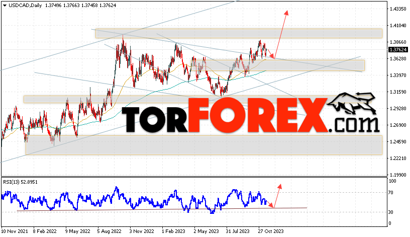 Дополнительным сигналом в пользу роста валютной пары USD/CAD выступит тест медвежьей линии тренда на индикаторе относительной силы. Вторым сигналом станет отскок от верхней границы нисходящего канала, который был пробит покупателями вверх. Отменой варианта роста котировок валютной пары USD/CAD на текущей торговой на неделе 20 — 24 ноября 2023 станет падение и пробой области 1.3365. Это укажет на пробой поддержки и продолжения падения в область ниже уровня 1.3175. Подтверждением росту по паре выступит пробой области сопротивления и закрытие цены над уровнем 1.3945.