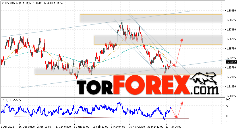 Таким образом, USD/CAD прогноз Канадский Доллар на 20 апреля 2023 предполагает попытку теста области поддержки вблизи уровня 1.3380. Далее, продолжение роста в область выше уровня 1.3675. Дополнительным сигналом в пользу подъёма Канадского Доллара на Форекс выступит тест линии тренда на индикаторе относительной силы. Отменой варианта роста котировок USD/CAD станет падение и пробой уровня 1.3265. Это укажет на продолжение снижения стоимости актива с потенциальной целью ниже уровня 1.3025.
