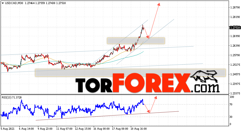 Дополнительным сигналом в пользу подъёма котировок Канадского Доллара выступит тест линии поддержки на индикаторе относительной силы. Вторым сигналом в пользу роста станет отскок от нижней границы бычьего канала. Отменой варианта роста валютной пары USD/CAD на Форекс станет падение и пробой области 1.2625. Это укажет на пробой области поддержки и продолжение падения котировок в область ниже уровня 1.2435. Ожидать подтверждения подъёма пары стоит с пробоем области сопротивления и закрытием котировок пары USD/CAD выше уровня 1.2785.