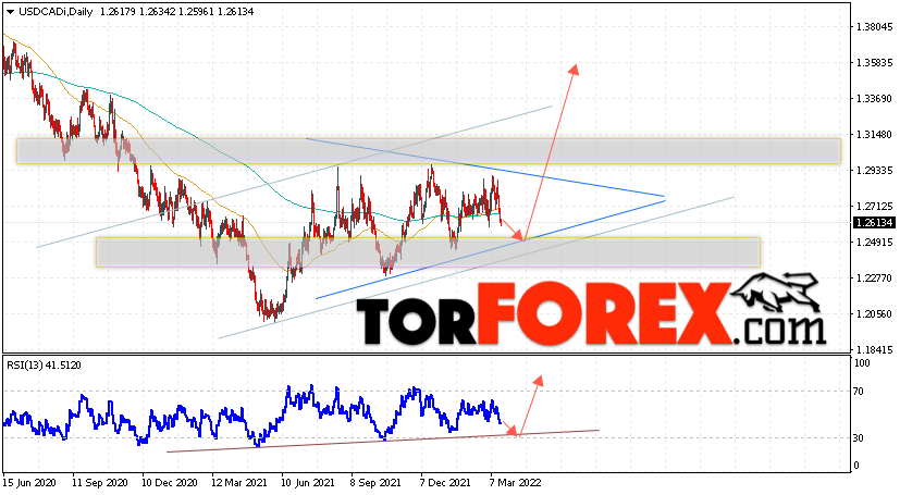 Дополнительным сигналом в пользу подъёма валютной пары USD/CAD выступит тест линии поддержки на индикаторе относительной силы. Вторым сигналом станет отскок от нижней границы бычьего канала, а также от нижней границы модели ”Треугольник”. Отменой варианта подъёма котировок валютной пары USD/CAD на текущей торговой на неделе 21 — 25 марта 2022 станет падение и пробой области 1.2305. Это укажет на пробой поддержки и продолжения падения в область ниже уровня 1.1935. Подтверждением подъёма по паре выступит пробой области сопротивления и закрытие цены над уровнем 1.3145, что укажет на пробой верхней границы модели ”Треугольник” и начало отработки этой модели.