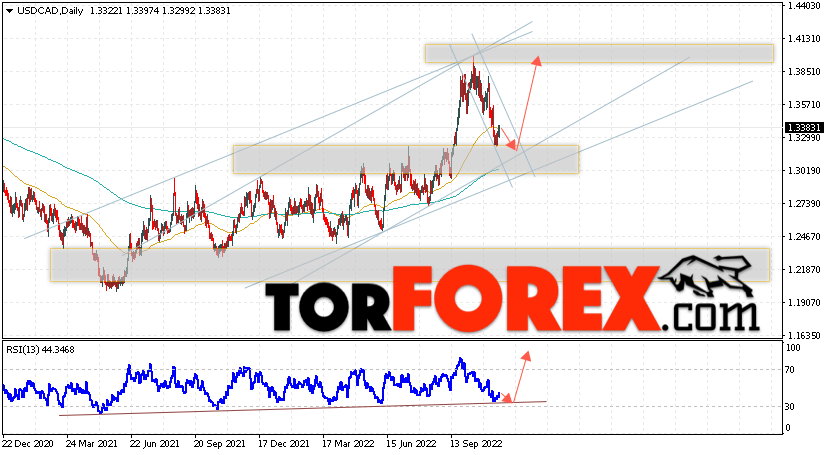 Дополнительным сигналом в пользу подъёма валютной пары USD/CAD выступит тест восходящей линии тренда на индикаторе относительной силы. Вторым сигналом станет отскок от нижней границы бычьего канала. Отменой варианта подъёма котировок валютной пары USD/CAD на текущей торговой на неделе 21 — 25 ноября 2022 станет падение и пробой области 1.2865. Это укажет на пробой поддержки и продолжения падения в область ниже уровня 1.2405. Подтверждением подъёма по паре выступит пробой области сопротивления и закрытие цены над уровнем 1.3485, что укажет на пробой верхней границы нисходящего канала коррекции.