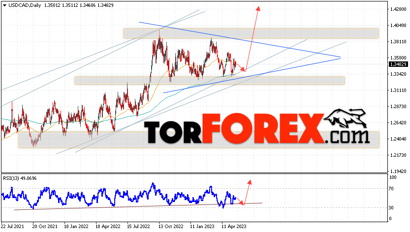 Дополнительным сигналом в пользу подъёма валютной пары USD/CAD выступит тест восходящей линии тренда на индикаторе относительной силы. Вторым сигналом станет отскок от нижней границы модели «Треугольник». Отменой варианта подъёма котировок валютной пары USD/CAD на текущей торговой на неделе 22 — 26 мая 2023 станет падение и пробой области 1.3075. Это укажет на пробой поддержки и продолжения падения в область ниже уровня 1.2775. Подтверждением подъёма по паре выступит пробой области сопротивления и закрытие цены над уровнем 1.3975, что укажет на пробой верхней границы модели «Треугольник» и начало отработки модели с целями вверху.