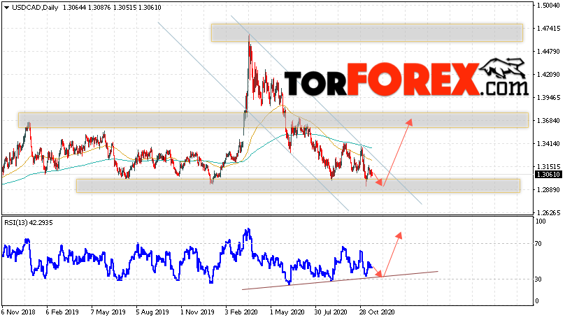Дополнительным сигналом в пользу подъёма валютной пары USD/CAD выступит тест линии поддержки на индикаторе относительной силы. Вторым сигналом станет отскок от нижней границы разворотной модели. Отменой варианта подъёма котировок валютной пары USD/CAD на текущей торговой на 23 — 27 ноября 2020 станет падение и пробой области 1.2765. Это укажет на пробой нижней границы модели и продолжения падения в область ниже уровня 1.2455. Подтверждением роста по паре выступит пробой области сопротивления и закрытие цен выше уровня 1.3455.