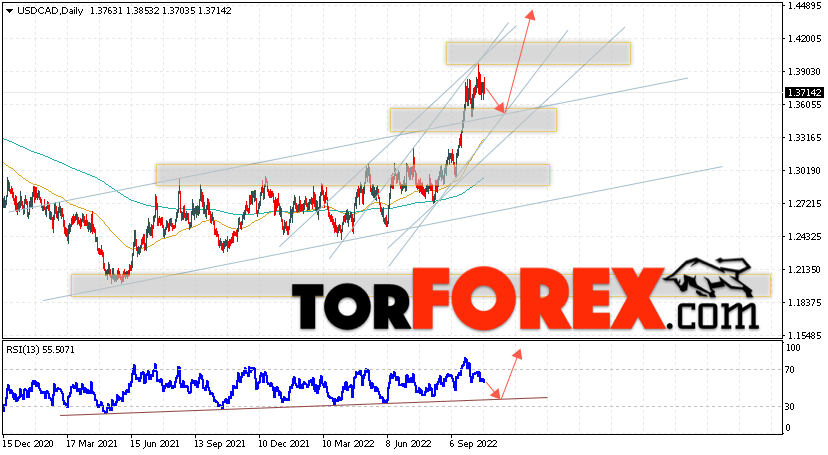 Дополнительным сигналом в пользу подъёма валютной пары USD/CAD выступит тест восходящей линии тренда на индикаторе относительной силы. Вторым сигналом станет отскок от верхней границы бычьего канала, который был пробит быками. Отменой варианта подъёма котировок валютной пары USD/CAD на текущей торговой на неделе 24 — 28 октября 2022 станет падение и пробой области 1.3315. Это укажет на пробой поддержки и продолжения падения в область ниже уровня 1.2865. Подтверждением подъёма по паре выступит пробой области сопротивления и закрытие цены над уровнем 1.4275.