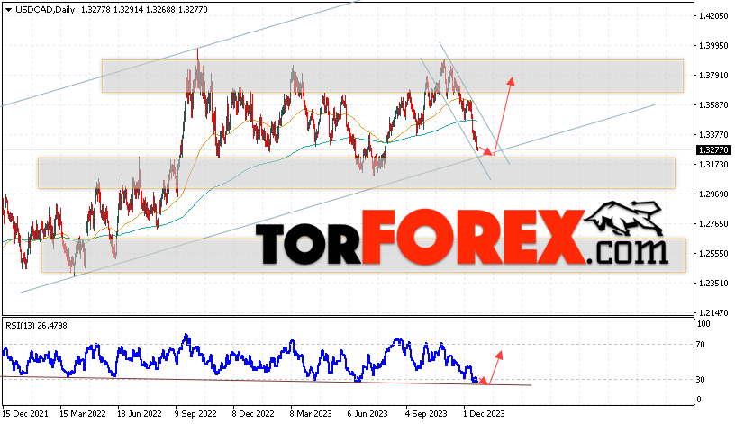 Таким образом, USD/CAD прогноз Канадский Доллар на 25 — 29 декабря 2023 предполагает попытку развития коррекции и теста области поддержки вблизи уровня 1.3205. Далее, продолжение роста с целью выше уровня 1.3795. Дополнительным сигналом в пользу подъёма выступит тест линии тренда на индикаторе относительной силы. Отменой варианта развития роста станет падение и пробой области 1.3965. Это укажет на пробой важного уровня поддержки и продолжение падения с целью ниже 1.2845.