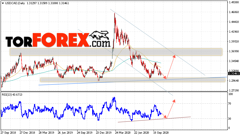 В пользу роста валютной пары USD/CAD выступит тест линии поддержки на индикаторе относительной силы. Вторым сигналом станет отскок от линии ”Шеи” разворотной модели ”Голова и плечи”. Отменой варианта подъёма котировок валютной пары USD/CAD на текущей торговой на 26 — 30 октября 2020 станет падение и пробой области 1.2775. Это укажет на пробой нижней границы канала и продолжения падения в область ниже уровня 1.2345. Подтверждением роста по паре выступит пробой области сопротивления и закрытие цен выше уровня 1.3485.