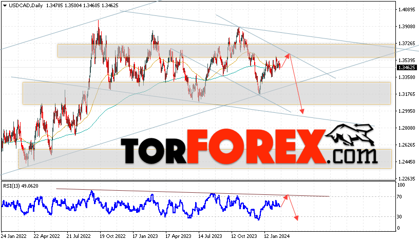 Дополнительным сигналом в пользу падения валютной пары USD/CAD выступит тест бычьей линии тренда на индикаторе относительной силы. Вторым сигналом станет отскок от верхней границы медвежьего канала. Отменой варианта снижения котировок валютной пары USD/CAD на текущей торговой на неделе 26 февраля — 1 марта 2024 станет сильный рост и пробой области 1.3735. Это укажет на пробой сопротивления и продолжения роста в область выше уровня 1.3955. Подтверждением падению по паре выступит пробой области поддержки и закрытие цены под уровнем 1.3165, что укажет на пробой нижней границы бычьего канала.