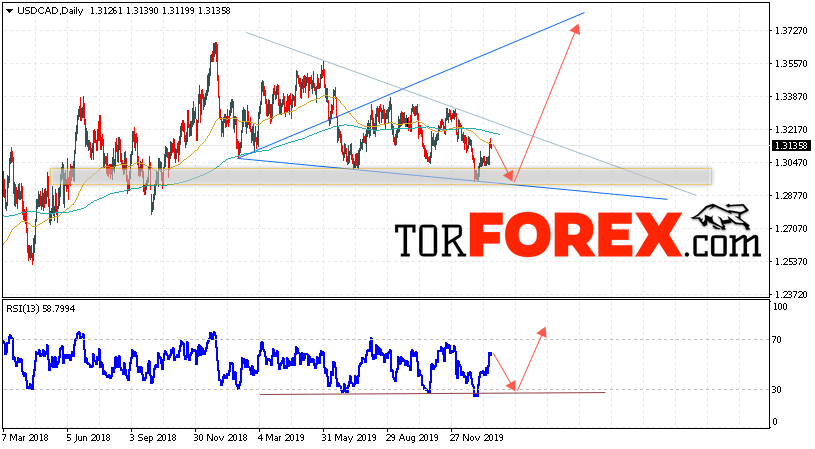Таким образом, USD/CAD прогноз Канадский Доллар на 27 — 31 января 2020 предполагает попытку теста области поддержки вблизи уровня 1.2925. Далее, продолжение роста с целью выше уровня 1.3725. Дополнительным сигналом в пользу подъёма выступит тест линии тренда на индикаторе относительной силы. Отменой варианта развития бычьей тенденции станет падение и пробой области 1.2715. Это укажет на пробой нижней границы модели и продолжение падения пары с целью ниже 1.2405.