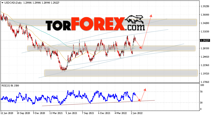 Дополнительным сигналом в пользу подъёма валютной пары USD/CAD выступит тест линии поддержки на индикаторе относительной силы. Вторым сигналом станет отскок от нижней границы бычьего канала. Отменой варианта подъёма котировок валютной пары USD/CAD на текущей торговой на неделе 27 июня — 1 июля 2022 станет падение и пробой области 1.2395. Это укажет на пробой поддержки и продолжения падения в область ниже уровня 1.1865. Подтверждением подъёма по паре выступит пробой области сопротивления и закрытие цены над уровнем 1.3225, что укажет на пробой верхней границы бычьего канала, а это сильный сигнал к покупкам.