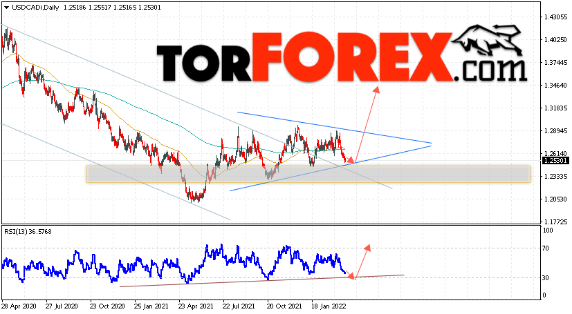 Дополнительным сигналом в пользу подъёма валютной пары USD/CAD выступит тест линии поддержки на индикаторе относительной силы. Вторым сигналом станет отскок от верхней границы нисходящего канала, а также от нижней границы модели ”Треугольник”. Отменой варианта подъёма котировок валютной пары USD/CAD на текущей торговой на неделе 28 марта — 1 апреля 2022 станет падение и пробой области 1.2265. Это укажет на пробой поддержки и продолжения падения в область ниже уровня 1.1765. Подтверждением подъёма по паре выступит пробой области сопротивления и закрытие цены над уровнем 1.3105, что укажет на пробой верхней границы модели ”Треугольник” и начало отработки этой модели.