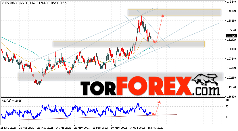 Дополнительным сигналом в пользу подъёма валютной пары USD/CAD выступит тест восходящей линии тренда на индикаторе относительной силы. Вторым сигналом станет отскок от нижней границы бычьего канала. Отменой варианта подъёма котировок валютной пары USD/CAD на текущей торговой на неделе 28 ноября — 2 декабря 2022 станет падение и пробой области 1.2935. Это укажет на пробой поддержки и продолжения падения в область ниже уровня 1.2465. Подтверждением подъёма по паре выступит пробой области сопротивления и закрытие цены над уровнем 1.3605, что укажет на пробой верхней границы нисходящего канала коррекции.