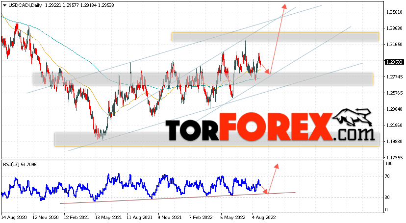 Дополнительным сигналом в пользу подъёма валютной пары USD/CAD выступит тест линии тренда на индикаторе относительной силы. Вторым сигналом станет отскок от нижней границы бычьего канала. Отменой варианта подъёма котировок валютной пары USD/CAD на текущей торговой на неделе 29 августа — 2 сентября 2022 станет падение и пробой области 1.2545. Это укажет на пробой поддержки и продолжения падения в область ниже уровня 1.2205. Подтверждением подъёма по паре выступит пробой области сопротивления и закрытие цены над уровнем 1.3255, что укажет на пробой верхней границы бычьего канала, а это сигнал к росту на ширину канала.