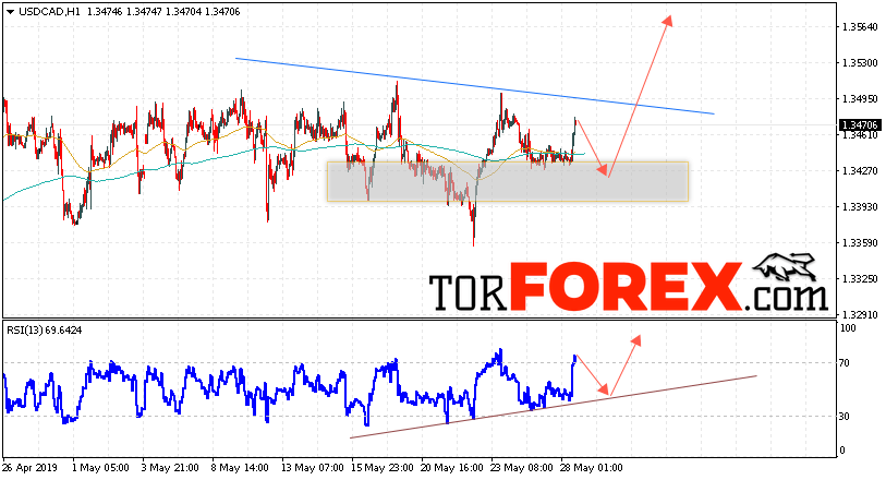 Таким образом, USD/CAD прогноз Канадский Доллар на 29 мая 2019 предполагает попытку теста области поддержки вблизи уровня 1.3405. Далее, продолжение роста в область выше уровня 1.3565. Дополнительным сигналом в пользу подъёма пары на Форекс выступит тест восходящей линии тренда на индикаторе относительной силы. Отменой варианта роста Канадского Доллара станет падение и пробой уровня 1.3330. Это укажет на продолжение снижения с потенциальной целью ниже уровня 1.3205.